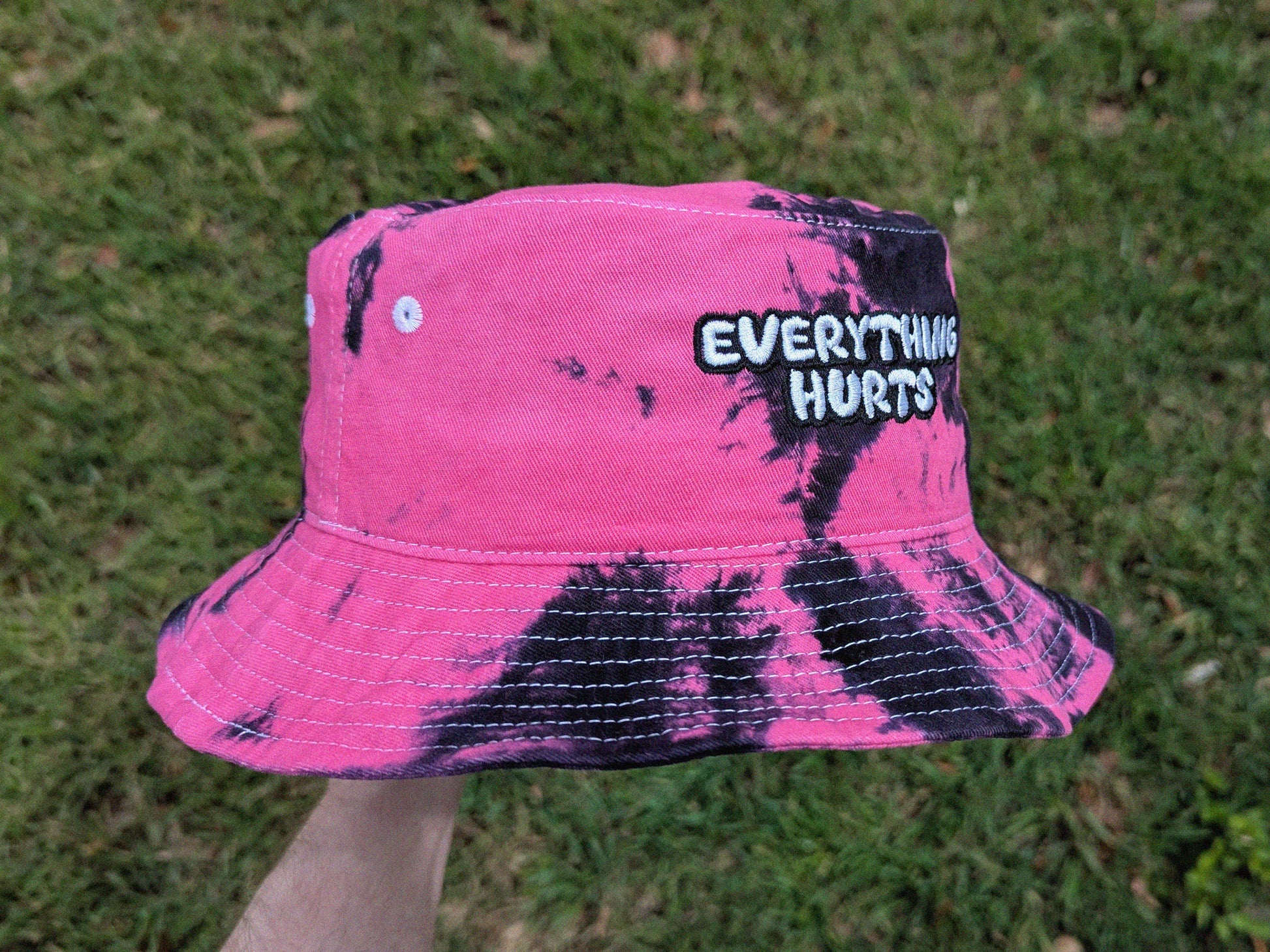 - A hand dyed bucket hat with "Everything Hurts" embroidered on it.
