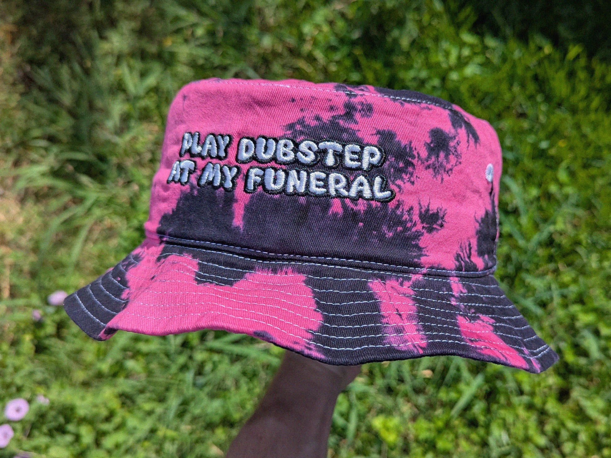 - A hand dyed bucket hat with "Play dubstep at my funeral" embroidered on it.