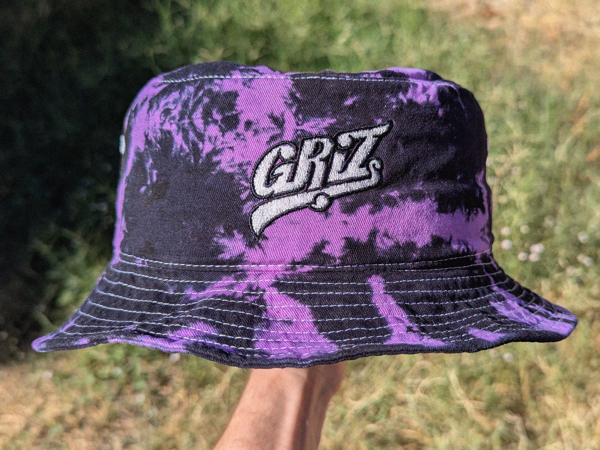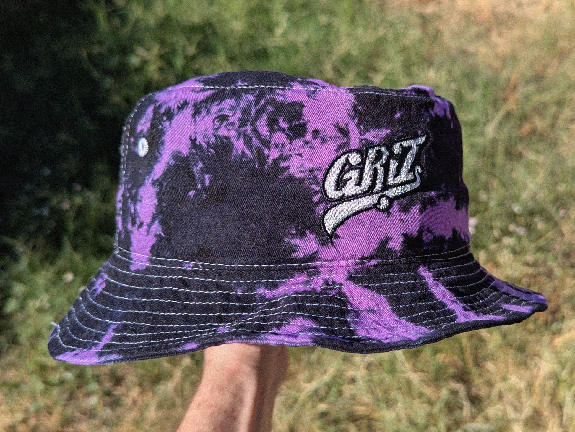 - A hand dyed bucket hat with GRIZ embroidered on it.