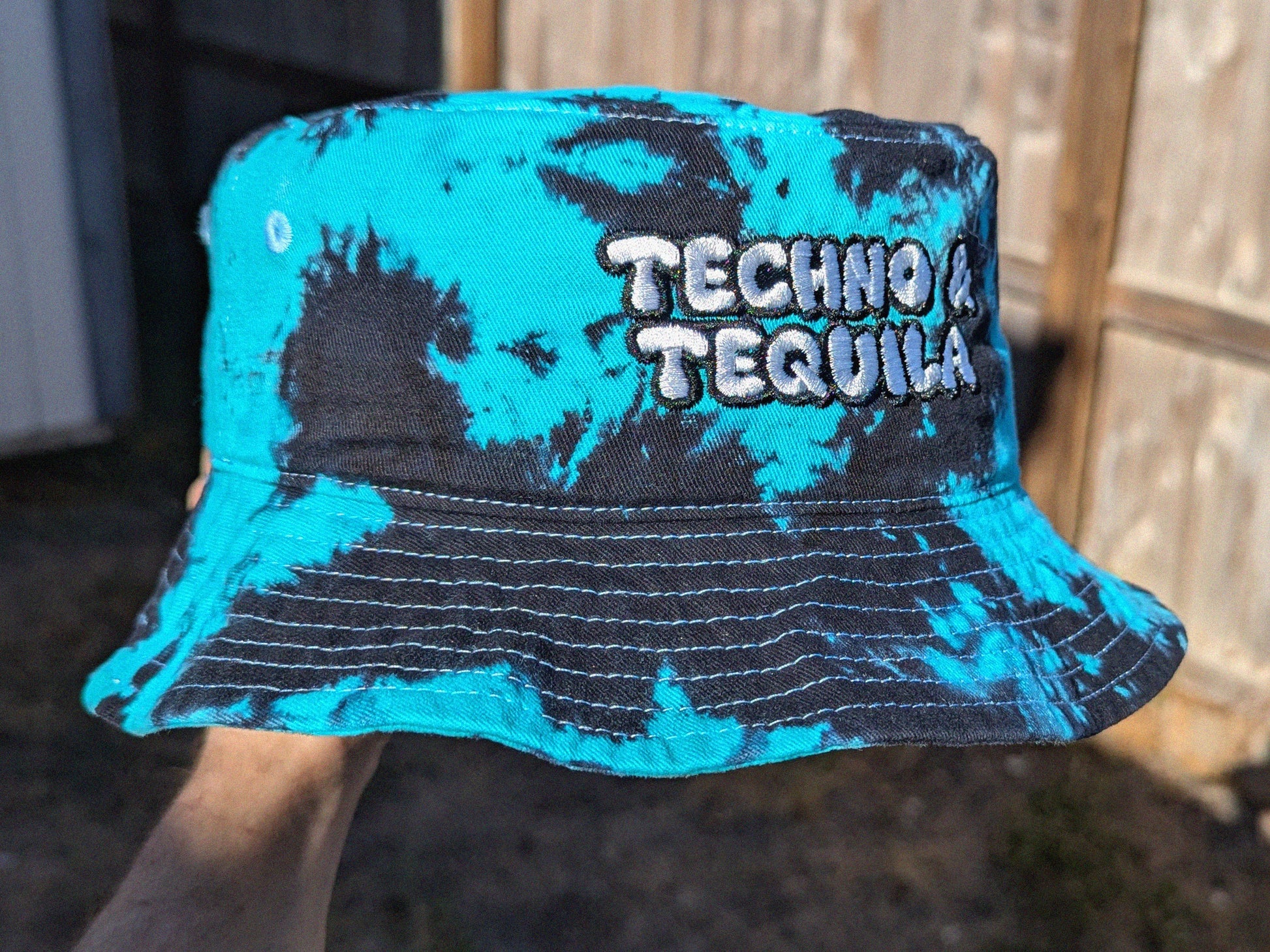 - A hand dyed bucket hat with "Techno & Tequila" embroidered on it.