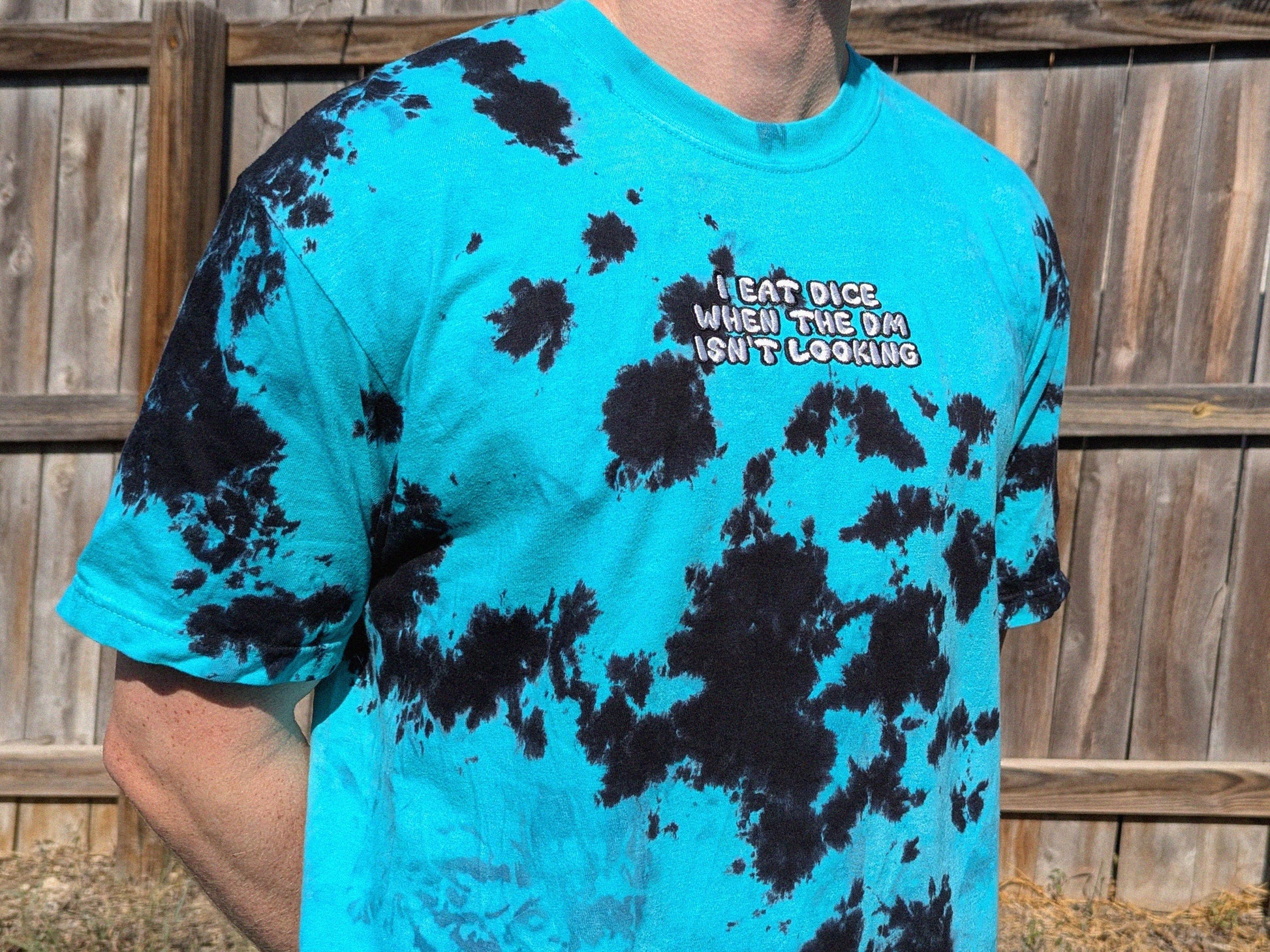 A hand dyed shirt with "I Eat Dice When The DM Isn't Looking" Embroidered on it