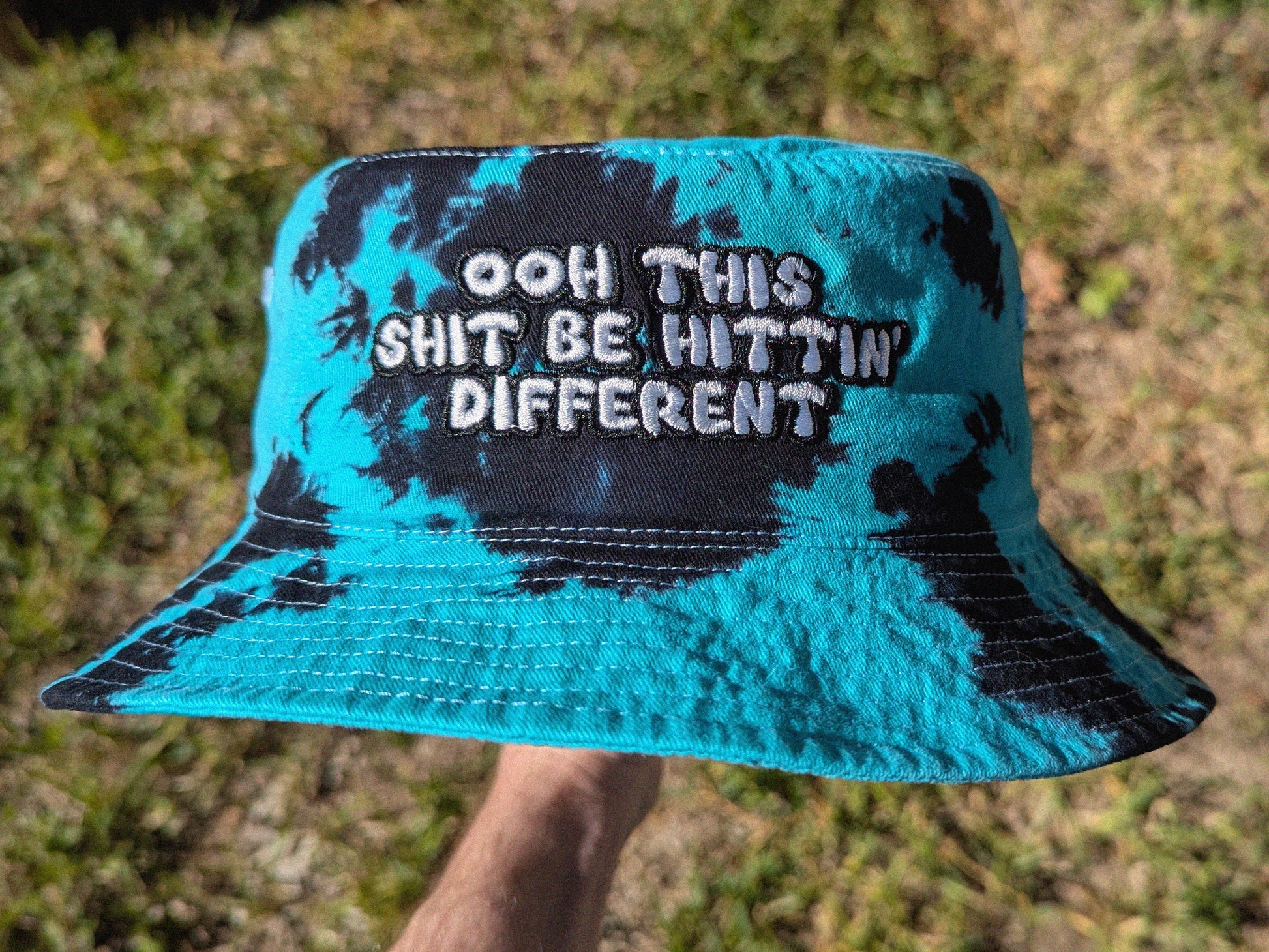 - A hand dyed bucket hat with "Ooh This Shit Be Hittin' Different" embroidered on it.