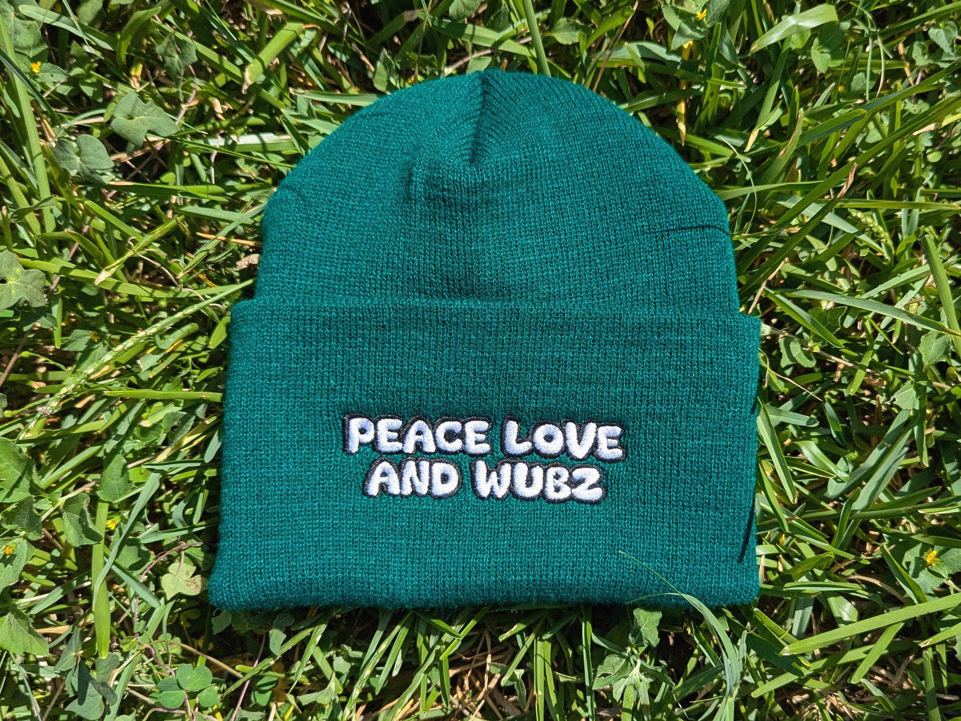 Peace Love and Wubz Embroidered Beanie Hat - Rave Festival Wear EDM Plur Wook Hat - Riddim Bass Music Dubstep Headwear Gift for Ravers